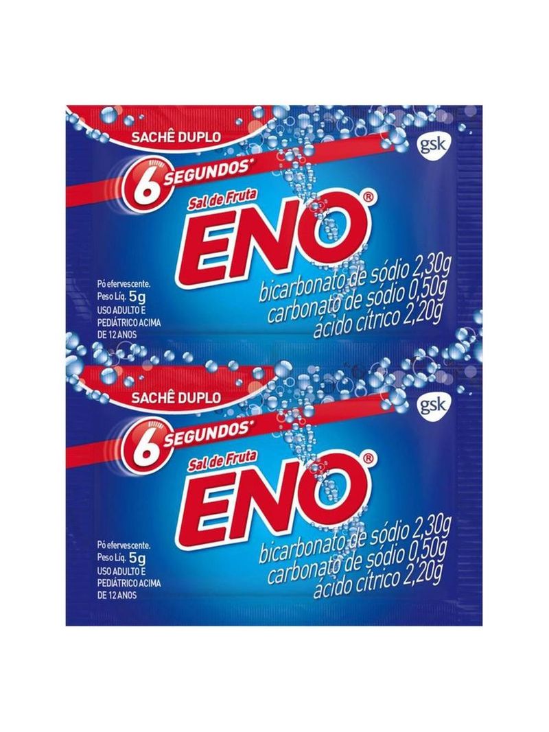 Leia a Bula;Sal de Fruta Eno Tradicional 5g com 2 Envelopes GSK é um medicamento. Seu uso pode trazer riscos. Procure o médico e o farmacêutico. Leia a Bula.