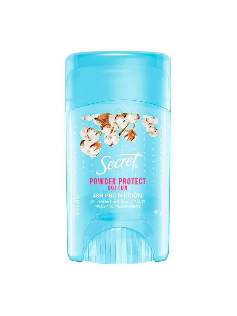 Secret permanece seco com uma aplicação suave e uniforme. A tecnologia ativada pelo suor usa moléculas neutralizadoras de odores para capturar o odor, bloqueá-lo e, em seguida, substituí-lo por um aroma fresco para mantê-lo com um cheiro limpo e fresco o dia todo. Secret ajuda a eliminar odores com controle de odores de 48 horas e proteção contra umidade. Aroma suave como algodão; Desodorante antitranspirante em gel, de rápida absorção e longa duração; Proteção contra suor e odores por 48 horas; Aplicação transparente. Não deixa manchas brancas nem resíduos na roupa na aplicação; Secret possui fórmula única e apresenta tecnologia patenteada ativada pelo suor, que captura odores e libera fragrâncias; Os antitranspirantes e desodorantes da Secret foram especialmente desenhados para se adaptarem às mudanças do corpo de uma mulher (ciclos hormonais, estresse, mudanças de temperatura) e responder com uma proteção personalizada contra o suor e,ou mau cheiro. Além disso, Secret é uma marca livre de crueldade certificada pela PETA. Remova o lacre de segurança, gire o disco da base até que o produto apareça, aplique diariamente, somente nas axilas, fechar bem após o uso.