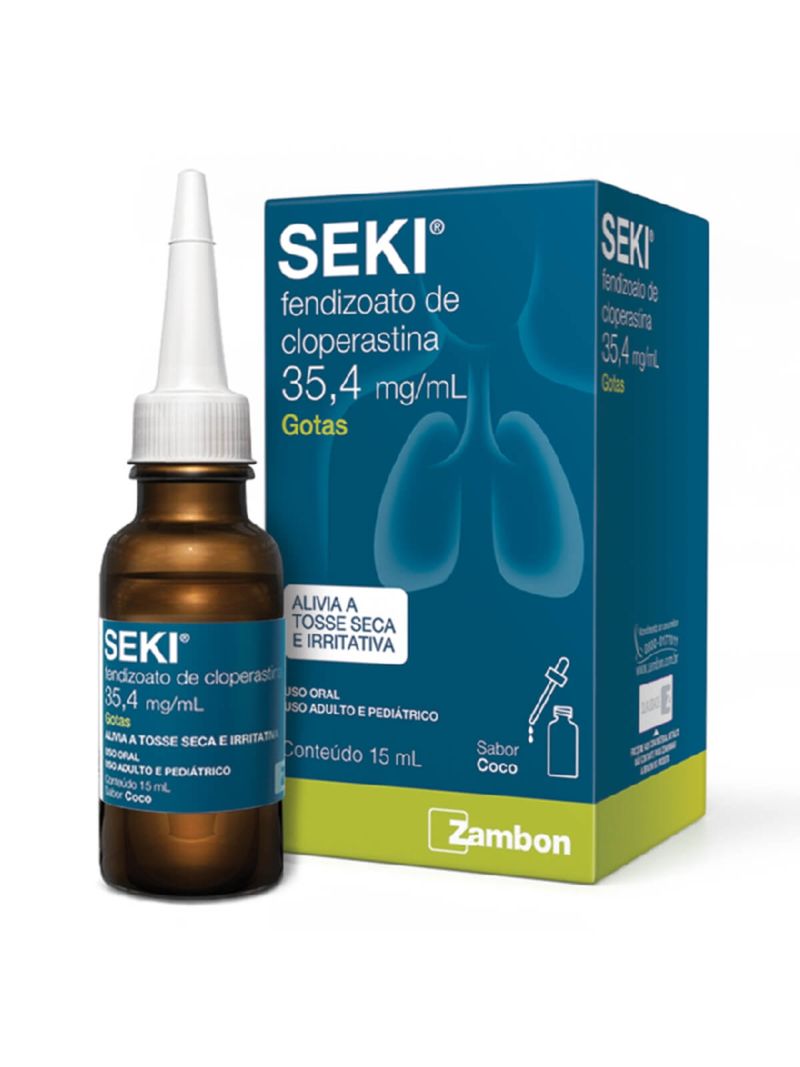 Seki é um medicamento antitussígeno, ou seja, inibe a tosse na qual não haja a produção de secreções (catarro). A ação de Seki inicia-se, em média, 30 minutos após a sua administração. Xarope Seki é um medicamento que obrigatoriamente não necessita de receita médica. Leia as informações da bula antes de utilizá-lo e, se não obtiver o efeito desejado ao fazer uso deste medicamento, suspenda o uso e procure orientação médica. Seki deve ser usado somente por via oral. Agite antes de usar;  Coloque o frasco na posição vertical e gire a tampa até romper o lacre; Use o copo medida graduado conforme a dose recomendada. Feche a tampa girando no sentido horário, para evitar que o produto perca suas características e consequentemente sua eficácia. Dosagem Adultos A dose usual é de 10 mL de xarope, 3 vezes ao dia ou a critério médico. A dose total diária é de 40 mL de xarope, que corresponde a 141,6 mg de fendizoato de cloperastina, podendo ser dividida por 4:1 dose pela manhã, 1 dose à tarde e 2 doses à noite. Crianças até 12 anos de idade A dose ponderal usual é de 0,5-1,0 mL/kg/dia de xarope (que corresponde a 1,77 a 3,54 mg/kg/dia), dividida em 3 tomadas diárias ou a critério médico, podendo a dose total usual ser dividida por 4: 1 dose pela manhã, 1 dose à tarde e 2 doses juntas à noite. Segue tabela com os exemplos que podem ser considerados para facilitar o cálculo da dose a ser administrada: Xarope - 0,5 a 1,0 mL/kg/dia Peso corpóreo (kg) Dose (mL) Manhã Tarde Noite 10 2,5 2,5 5 20 5 5 10 30 7,5 7,5 15 ≥40 10 10 20 Não utilizar mais que 60 mL de xarope por dia. Siga corretamente o modo de usar. Em caso de dúvidas sobre este medicamento, procure orientação do farmacêutico. Não desaparecendo os sintomas, procure orientação de seu médico ou cirurgião dentista. Gotas Seki é um medicamento que obrigatoriamente não necessita de receita médica. Leia as informações da bula antes de utilizá-lo e, se não obtiver o efeito desejado ao fazer uso deste medicamento, suspenda o uso e procure orientação médica. Seki deve ser usado somente por via oral. Agite antes de usar; Coloque o frasco na posição vertical e gire a tampa até romper o lacre; Rosqueie completamente o gotejador e retire a sua tampa protetora para fazer uso; Inverta o frasco e aperte o gotejador para obter o número de gotas recomendado; Administre as gotas em uma colher ou se preferir, diluídas em um pouco d’ água; Tampe o gotejador para evitar que o produto perca suas características e consequentemente sua eficácia. Dosagem Adultos A dose usual é de 20 gotas da suspensão oral, 3 vezes ao dia ou a critério médico. A dose total diária é de 80 gotas da suspensão oral, que corresponde a 141,6 mg de fendizoato de cloperastina, podendo ser dividida por 4:1 dose pela manhã, 1 dose à tarde e 2 doses à noite. Crianças até 12 anos de idade A dose ponderal usual é 1-2 gotas/kg/dia (que corresponde a 1,77 a 3,54 mg/kg/dia), dividida em 3 tomadas diárias ou a critério médico, podendo a dose total usual ser dividida por 4: 1 dose pela manhã, 1 dose à tarde e 2 doses juntas à noite. Segue a tabela com os exemplos que podem ser considerados para facilitar o cálculo da dose a ser administrada: Suspensão oral (gotas) - 1 a 2 gotas/kg/dia Peso corpóreo(kg) Dose (mL) Manhã Tarde Noite 10 5 5 10 20 10 10 20 30 15 15 30 ≥40 20 20 40 Não utilizar mais que 120 gotas da suspensão oral por dia. Siga corretamente o modo de usar. Em caso de dúvidas sobre este medicamento, procure orientação do farmacêutico. Não desaparecendo os sintomas, procure orientação de seu médico ou cirurgião dentista. Cada 1 mL de xarope contém: Fendizoato de cloperastina 3,54 mg Excipientes q.s.p 1 mL Excipientes: celulose microcristalina, carboximetilcelulose, estearato de macrogol 2000, sacarose, metilparabeno, propilparabeno, aroma de coco, ácido clorídrico, hidróxido de sódio e água purificada. Conteúdo de sacarose por mL: 450 mg, Cada 1 mL de suspensão oral (gotas) contém: Fendizoato de cloperastina 35,4 mg Excipientes q.s.p 1 mL Excipientes: sacarose, estearato de macrogol 2000, dióxido de silício coloidal, metilparabeno, propilparabeno, aroma de coco, ácido clorídrico, hidróxido de sódio e água purificada. Cada 1 mL de suspensão oral corresponde a 20 gotas. Conteúdo de sacarose por mL: 140 mg. Conservar em temperatura ambiente (entre 15ºC e 30ºC). Número de lote e datas de fabricação e validade: vide embalagem. Não use medicamento com prazo de validade vencido. Guarde-o em sua embalagem original. Após aberto, válido por 30 dias. Características do medicamento Seki é uma suspensão de cor branca com odor e sabor de coco adocicado. Antes de usar, observe o aspecto do medicamento. Caso ele esteja no prazo de validade e você observe alguma mudança no aspecto, consulte o farmacêutico para saber se poderá utilizá-lo. Todo medicamento deve ser mantido fora do alcance das crianças. Xarope 3,54 mg Frasco com 120 mL + copo medida. Uso oral. Uso adulto e pediátrico. Suspensão oral (gotas) 35,4 mg Frasco com 15 mL + gotejador. Uso oral. Uso adulto e pediátrico.