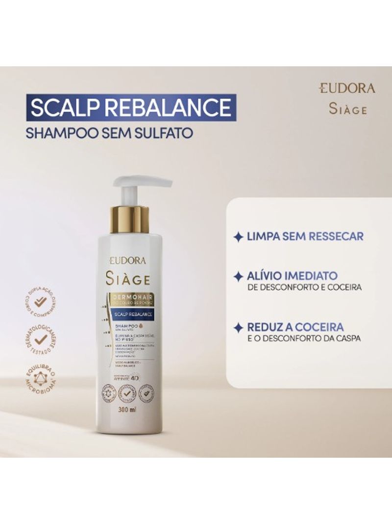 "O Scalp Rebalance vai tratar a caspa visível, a coceira, vermelhidão, a descamação e esse couro cabeludo que está sensibilizado. Este shampoo promove uma limpeza que não resseca os fios e atua no equilíbrio do microbioma, aliviando o desconforto.” Especialista em inovação capilar de Eudora Siàge