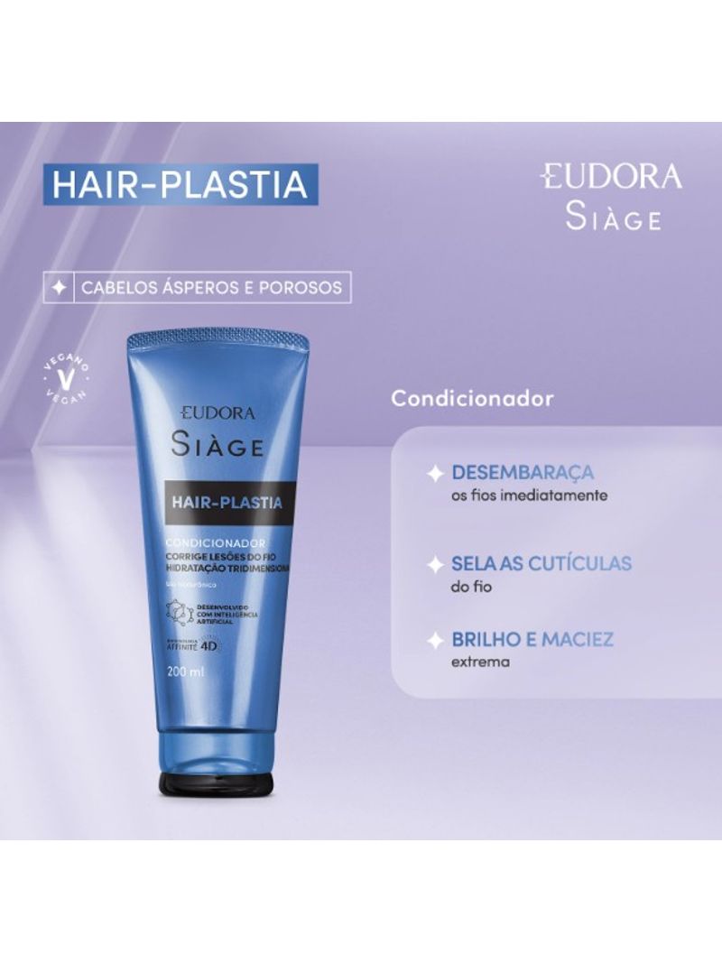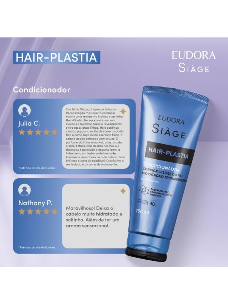 “A linha completa de Siàge Hair-Plastia oferece tratamento profissional que age em todas as camadas do fio, devolvendo seu cabelo ao melhor estado.” Expert em cabelos de Eudora