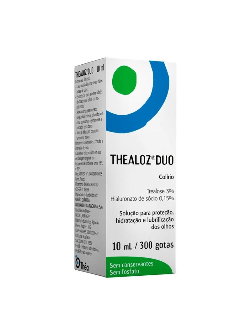 Thealoz Duo é uma solução oftálmica composta por trealose (3%), hialuronato de sódio (0,15%), cloreto de sódio, trometamol, ácido clorídrico e água para preparações injetáveis. Thealoz Duo é uma solução estéril, isenta de fosfatos, hipotónica e de pH neutro.