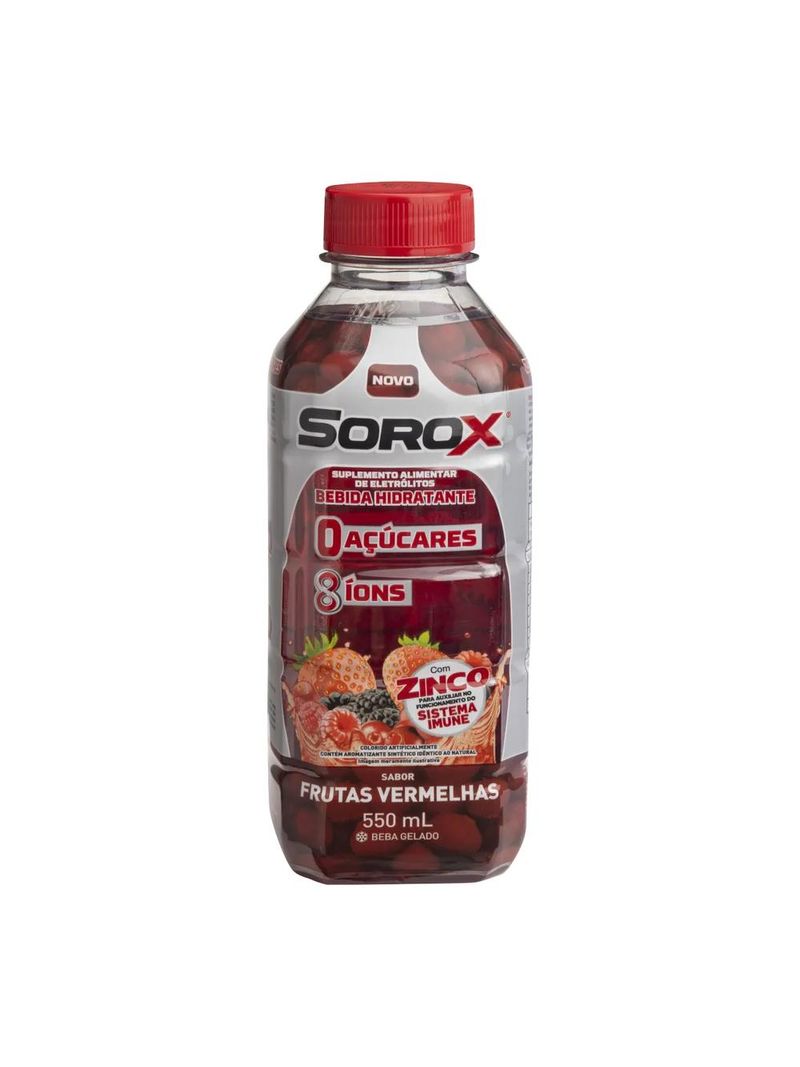 O que é e para que serve o Sorox Frutas Vermelhas? Sorox é uma bebida refrescante e saborosa, desenvolvida especialmente para o paladar brasileiro e ideal para auxiliar na hidratação diária. Livre de açúcares e com menos de 10 calorias, seu consumo ajuda a recuperar de forma rápida os 8 minerais importantes que perdemos ao longo do dia, além de auxiliar o funcionamento do sistema imune. Sabor Frutas Vermelhas. Como tomar o Sorox Frutas Vermelhas? Recomenda-se o consumo de 1 garrafa de Sorox (550ml) diariamente. Advertências Uso oral. Este produto é indicado para indivíduos com 19 anos ou mais. Este produto não é um medicamento. Não exceder a recomendação diária de consumo indicada na embalagem. colorido artificalmente. Contém aromatizante sintético idêntico ao natural. Mantenha fora do alcance de crianças. Conserve em temperatura ambiente (entre 15 ºc e 30 ºc). proteger da luz e umidade.