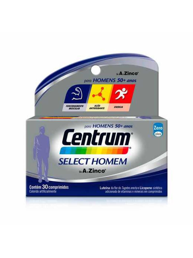 Centrum Homem Select é um multivitamínico, completo de A a Zinco, que contém uma combinação de cálcio e vitamina D e contribui para a manutenção normal dos ossos; vitaminas do complexo B, que ajudam no aproveitamento da energia dos alimentos; e vitaminas C e E, manganês e selênio, que ajudam a proteger as células da ação dos radicais livres.