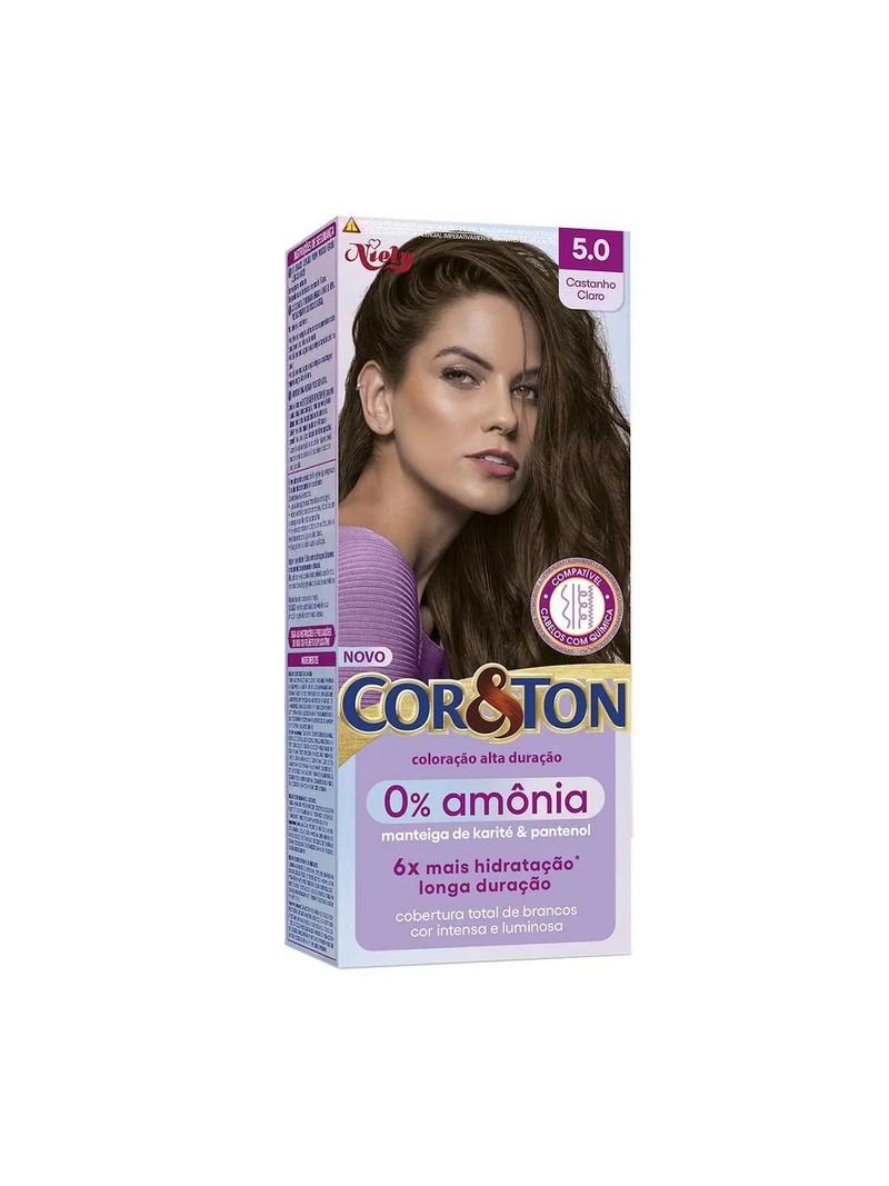 O que é a tintura Cor&Ton Niely?Cor&Ton da Niely é uma tintura com tecnologia 0% de amônia para maior duração.Tonalidade5.0 Castanho claro.Para que serve a tintura Cor&Ton Niely?Indicado para todos os tipos de cabelo e compatível mesmo com cabelos quimicamente tratados, a tintura Cor&Ton Niely oferece total cobertura de brancos com cor intensa e luminosa e um cabelo macio e nutrido com 6x mais hidratação, por conta da Manteiga de Karité e Pantenol, ativos que ainda garantem ação antirressecamento e brilho intenso.Benefícios e diferenciais da tintura Cor&Ton NielyColoração com 0% de amônia.Total cobertura de brancos.Cor intensa e luminosa.Cabelo macio e nutrido.Coloração de longa duração.6x mais hidratação.Possui tratamento com Manteiga de Karité e Pantenol.Efeito ultrahidatante, com ação antirressecamento e brilho intenso.Indicado para todos os tipos de cabelo.Compatível com cabelos quimicamente tratados.Como usar a tintura Cor&Ton Niely?Coloque as luvas.Despeje todo o conteúdo da bisnaga de Cor&Ton em uma vasilha de plástico com toda a Emulsão Reveladora. Com o auxílio de um pincel, misture bem até formar uma consistência homogênea.É recomendável esperar por um período de 15 dias entre a desfrisagem (alisamento e relaxamento) ou permanente e coloração.AdvertênciasEm caso de reação durante a aplicação como: Coceira, irritação, erupção cutânea ou sensação de ardência do couro cabeludo, enxágue imediatamente e suspenda o uso.Em caso de dificuldades para respirar, peça imediatamente assistência médica e entre em contato com o fabricante.Antes de refazer uma coloração, consulte um médico.Mantenha fora do alcance das crianças.