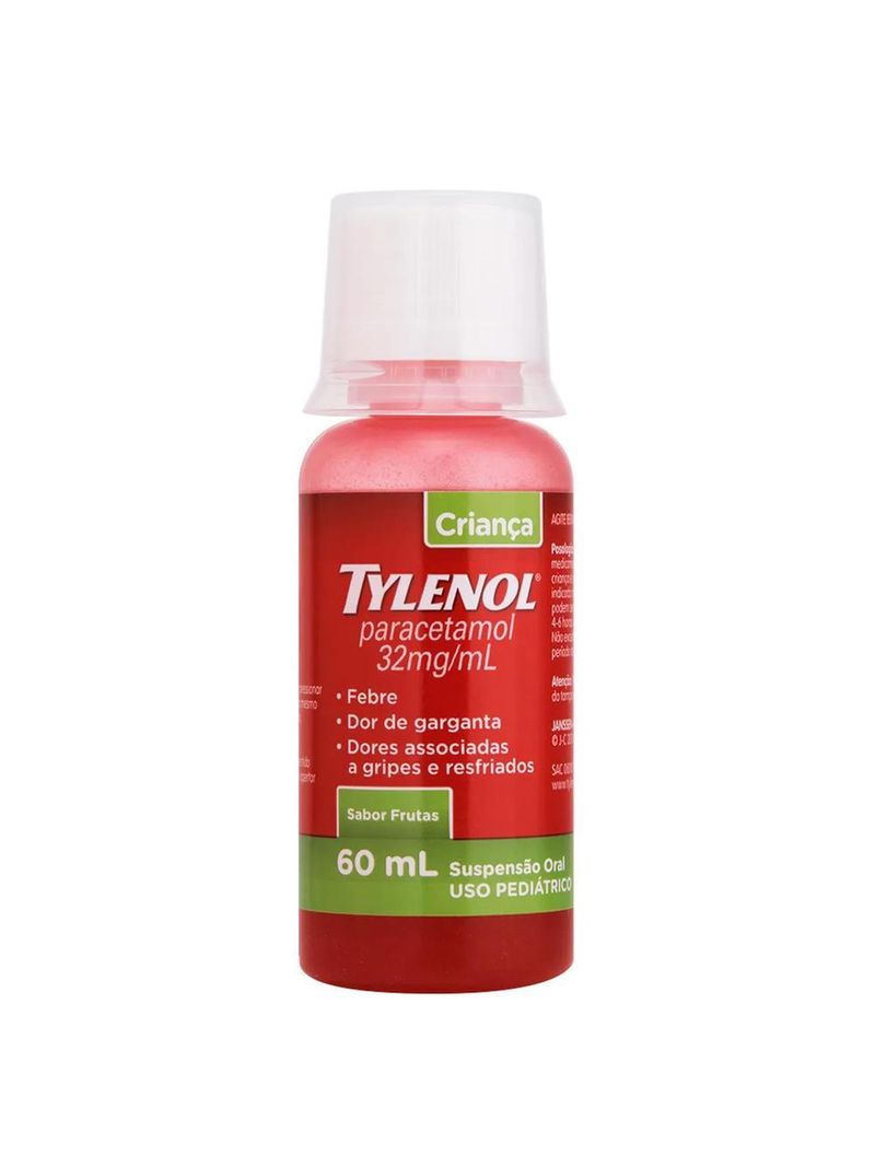 Para que serve o Tylenol Criança? TYLENOL® Criança reduzem a febre atuando no centro regulador da temperatura no Sistema Nervoso Central (SNC) e também diminuem a sensibilidade para a dor. O efeito destes medicamentos se inicia dentro de 15 a 30 minutos após a administração. Além disso auxilia no alívio de dores leves e moderadas da infância, como dores associadas ao crescimento, de dente e garganta. Como usar o Tylenol Criança? Uso oral. O paracetamol pode ser administrado independentemente das refeições. TYLENOL® Criança: Para utilizar o copo-medida, encha-o até o nível correspondente em mL. Consulte a bula para verificar a relação do peso ao ml. Instruções para abrir e fechar o frasco Agite o frasco. Para abrir o frasco é preciso pressionar a tampa para baixo e girar ao mesmo tempo no sentido anti-horário, mantendo-a pressionada. Para fechar, basta girar no sentido contrário ao de abertura sem apertar em demasia. Advertências A dose diária total de paracetamol não deve exceder tanto a dose de 75mg/kg quanto 4000mg no período de 24 horas. Crianças abaixo de 12 anos: a dose recomendada de paracetamol varia de 10 a 15 mg/kg/dose, com intervalos de 4-6 horas entre cada administração. Não exceda 5 administrações (aproximadamente 50-75 mg/kg), em um período de 24 horas. Para crianças abaixo de 11 kg ou 2 anos, consulte o médico antes do uso. TYLENOL® Criança: para uma posologia correta, administre a dose do medicamento de acordo com o peso da criança e o volume (mL) correspondente indicado no copo de medida. Duração do tratamento: depende do desaparecimento dos sintomas. Consulte as tabelas abaixo para saber a dose correta. Recomendado para crianças a partir de 3 anos.