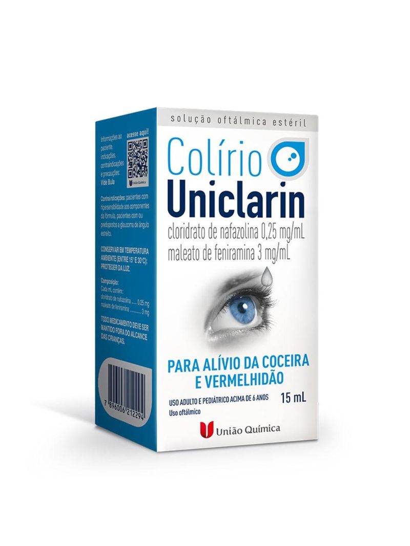 Uniclarin é indicado para o alívio da vermelhidão dos olhos causada por poluição, fumaça, pó, pelos de animais, pólen, grama, caspa, bem como os sintomas leves de coceira.