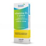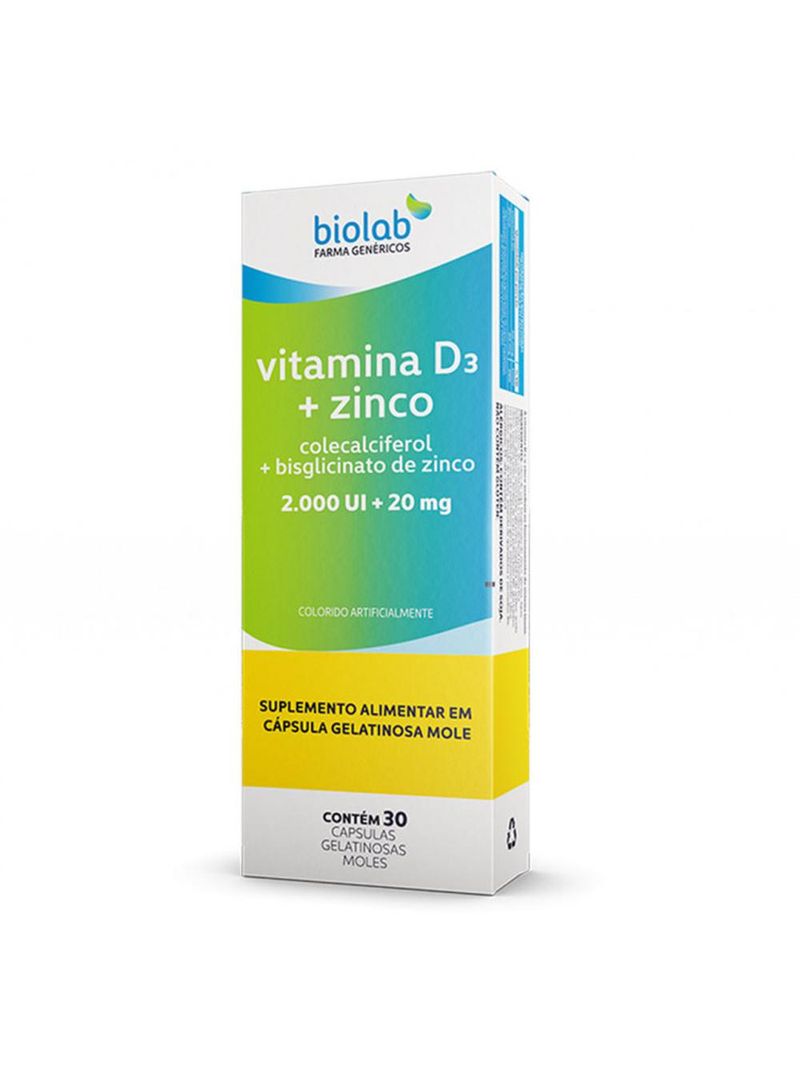 Vitamina D3+Zinco 2000UI/20mg c/30 Cápsulas Biolab - Associação da vitamina D, também conhecida como colecalciferol e o zinco um mineral essencial para a nossa saúde - A Vitamina D, também conhecida como colecalciferol, é um hormônio que regula a quantidade de cálcio e fósforo no organismo - Além das funções relacionadas à saúde dos ossos, a vitamina D também é responsável por atuar no sistema imunológico - O Zinco é um mineral essencial para o funcionamento adequado do sistema imunológico, influenciando na proliferação e maturação das células de defesa do organismo. Adicionalmente, o zinco possui outras funções benéficas, pois auxilia na proteção dos danos causados pelos radicais livres.